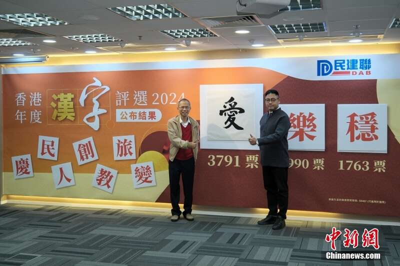 1月15日,香港民主建港协进联盟(香港民建联)公布“香港年度汉字评选2024”评选结果,在“人”“爱”“稳”“变”“教”“庆”“旅”“乐”“创”“民”十个候选汉字中,“爱”字以3791票当选年度汉字。图为香港民建联创党主席曾钰成(左)、香港民建联秘书长叶傲冬公布香港年度汉字“爱”。