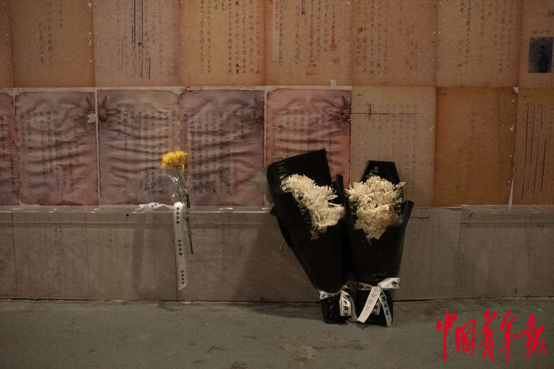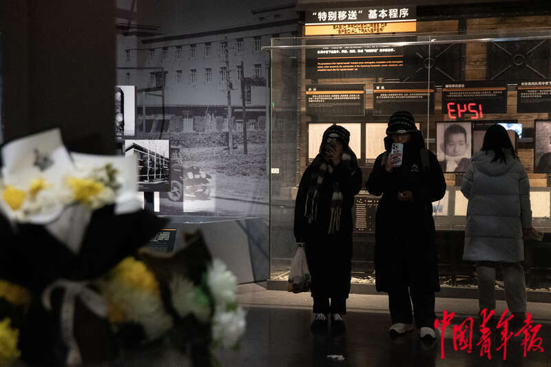 1月14日,黑龙江哈尔滨,侵华日军第七三一部队旧址——本部旧址,一楼中心走廊的“殉难者名单墙”前,参观者敬献的菊花寄托着哀思。中青报·中青网记者 程璨/摄