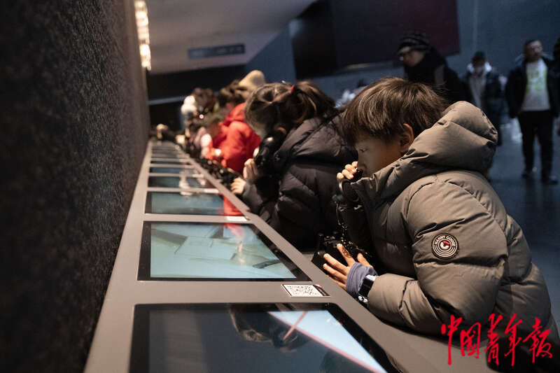 1月14日,黑龙江哈尔滨,侵华日军第七三一部队罪证陈列馆,8岁的阳阳全神贯注地观看着展示罪行证据的视频。他和家人计划在哈尔滨停留两天,主要目的是参观这一展览,以铭记那段历史。中青报·中青网记者 程璨/摄