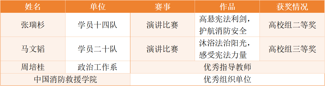 为进一步弘扬宪法精神,加强法治文化教育,增强全民法治观念,中共北京市委教育工作委员会、北京市教育委员会举办了2024年北京市学生“学宪法·讲宪法”系列活动、十一届北京市师生法治教育作品征集活动并于近日公布了评选结果,中国消防救援学院6名师生荣获佳绩,学院获评优秀组织单位。