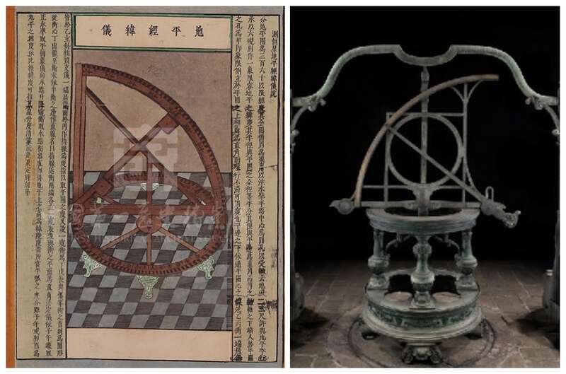 △左为《赤道南北两总星图》中的地平经纬仪图,右为北京古观象台的地平经纬仪。