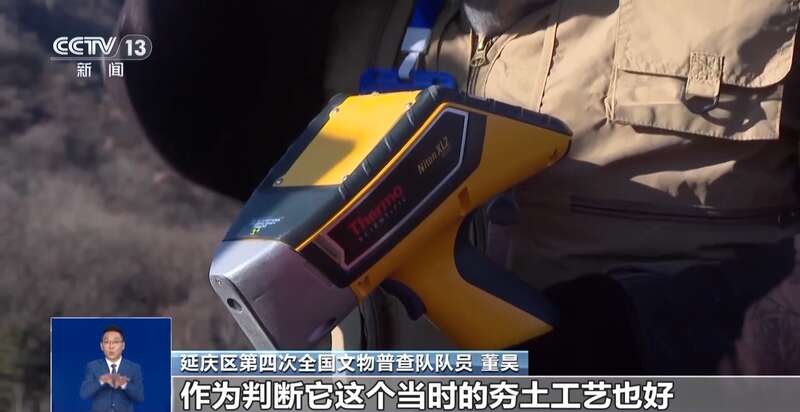 延庆区第四次全国文物普查队队员 董昊:这个仪器就是手持荧光能普分析仪,主要是测一下矿物的氧化物含量和元素含量,作为判断当时的夯土工艺也好,修建年代也好的一个佐证。