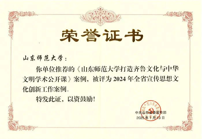 课程讲稿合集《齐鲁文化与中华文明学术公开课》已由山东人民出版社连续出版三辑,在学术界产生广泛影响。中国社会科学网、大众网、《联合日报》、齐鲁壹点等新闻媒体对公开课进行了宣传报道。 该课程已获评省级研究生课程思政示范课程、省级研究生优质课程。