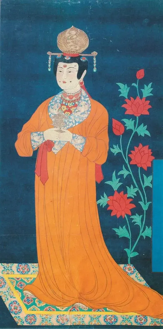 唐代回鹘族女子的冠式有花蕾冠、桃形冠、元宝冠。桃形冠造型上小下大,宛如仙桃。这是回鹘族女子最具代表性的冠式,敦煌莫高窟,安西榆林窟回鹘国天圣公主供养像均戴桃形冠。与桃形冠配套的是发式上诱花钿、钗、步摇,戴耳饰,多层项链,服饰红绢后垂,长至臀部。