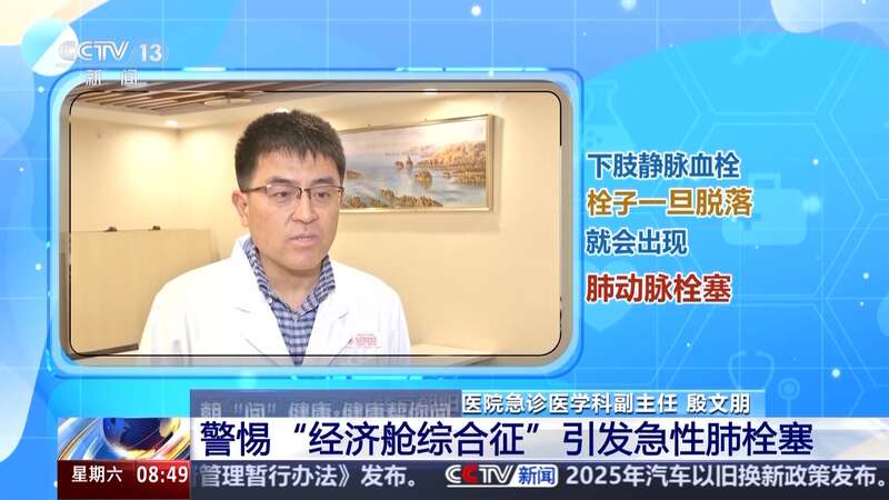 首都医科大学附属北京朝阳医院急诊医学科副主任 殷文朋:因为长时间我们坐在一个相对狭小的空间,我们坐的同时下肢静脉的回流就不好,我们长时间压在静脉上面时,如果再有一些基础的血管问题,就会出现下肢静脉血栓。栓子一旦脱落,就会出现肺动脉栓塞。