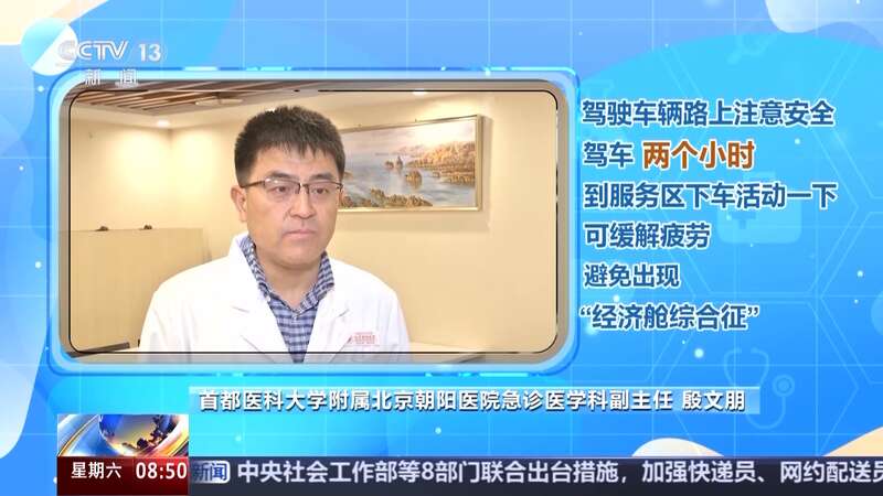 首都医科大学附属北京朝阳医院急诊医学科副主任 殷文朋:在长途坐飞机旅行的时候,一个半小时左右站起来走一走,可预防“经济舱综合征”。驾驶车辆路上要注意安全,驾车两小时到服务区下车活动一下,可缓解疲劳,又能避免出现“经济舱综合征”。