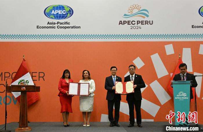 2024年11月15日,亚太经合组织第三十一次领导人非正式会议期间,中国香港与秘鲁在秘鲁利马签署自由贸易协定。图为秘鲁总统博鲁阿尔特(左二)、秘鲁外贸旅游部部长莱昂(左一)、香港特区行政长官李家超(右三)、香港特区政府商务及经济发展局局长丘应桦(右二)完成签署后合影。 香港特区政府新闻处供图
