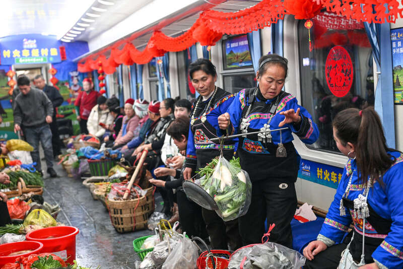 1月18日,在5640次列车上,乘客在“乡村集市”车厢购买蔬菜。新华社发(余天英 摄)