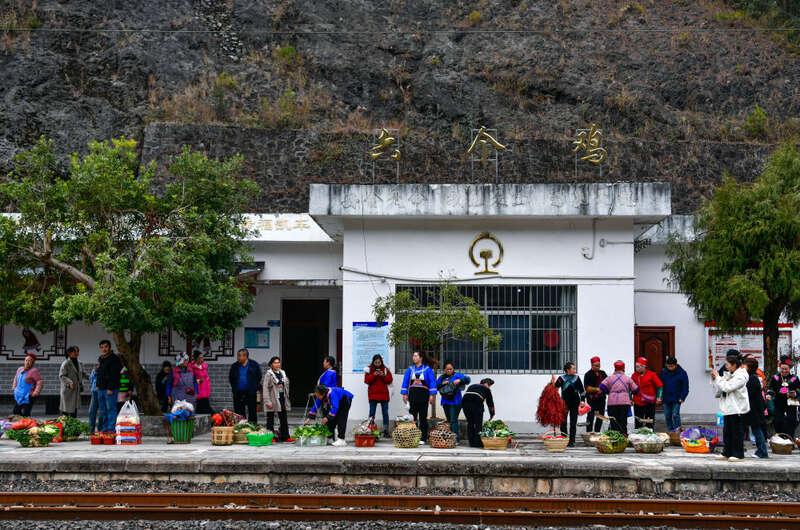 1月18日,在沪昆铁路六个鸡火车站,村民准备登上5640次列车售卖蔬菜和年货。新华社记者 杨文斌 摄