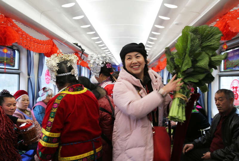 1月18日,少数民族演员在5640次列车上给乘客和村民跳苗族锦鸡舞。新华社记者 杨文斌 摄