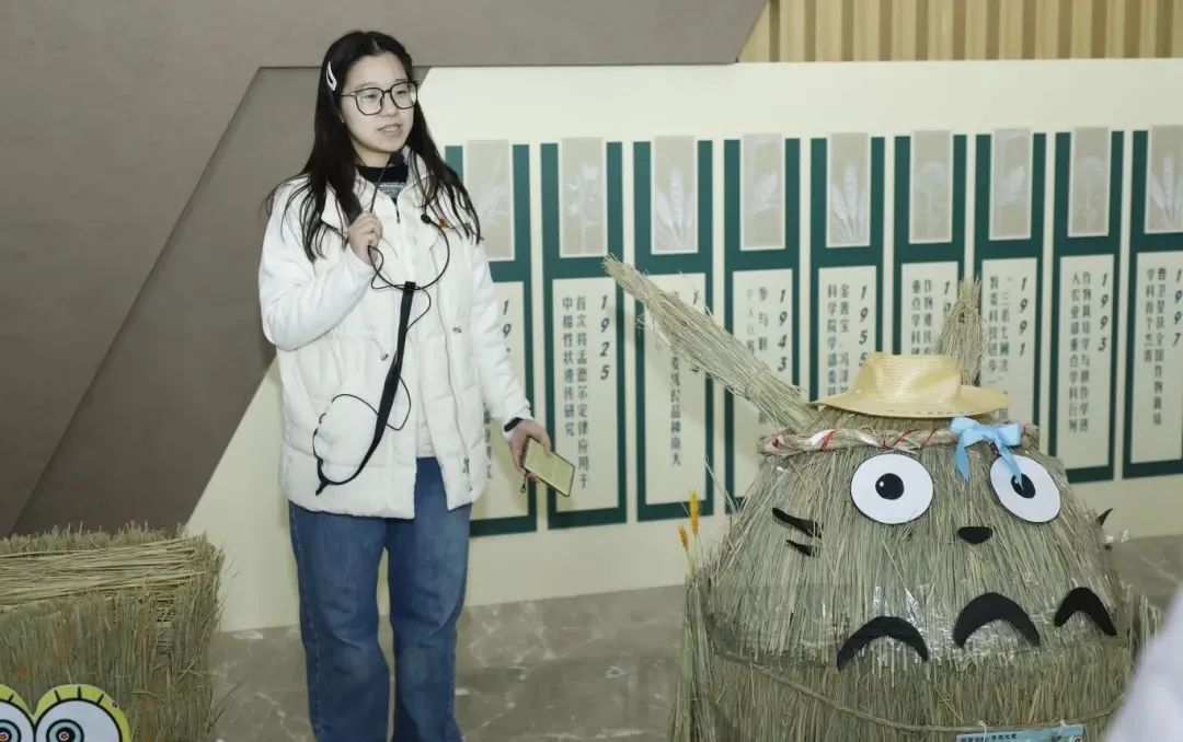 “这是我们用稻草编织出来的龙猫,它胖胖的身体,给人一种安全感和亲切感,而它巨大的爪子,则象征着自然的力量,寓意这农作物为全球粮食安全提供了保障,龙猫身穿‘二十四节气’外衣,胸前是春分,我们定义成长关键词是希望,背后是冬至,我们定义成长关键词是积累……”来自农学院农耕对话青年成长宣讲团的高一菲正在为大家做作品介绍。