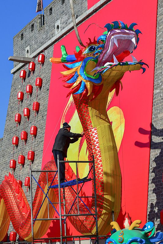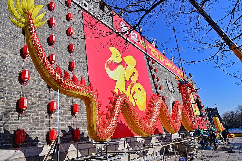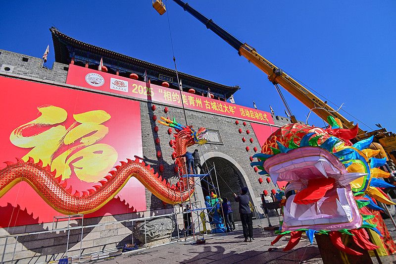 2025年1月20日,山东潍坊,在青州古城景区,数米高“福”字亮相城墙,工作人员忙着扎制组装龙灯。连日来,山东省青州古城景区加紧赶制、安装各种大型花灯,为即将到来的春节营造浓郁喜庆气氛。