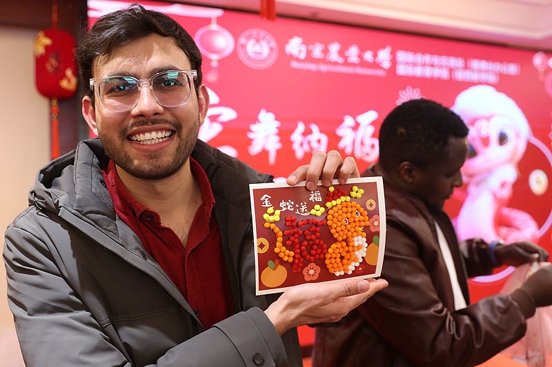 2025年1月19日,南京农业大学留学生展示自己制作的春节手工艺品。当日,“蛇舞纳福 巳巳如意”迎新春主题活动在南京农业大学举行,来自该校国际合作与交流处、国际教育学院的中外师生一起制作春节传统手工艺品,品味浓浓年味。