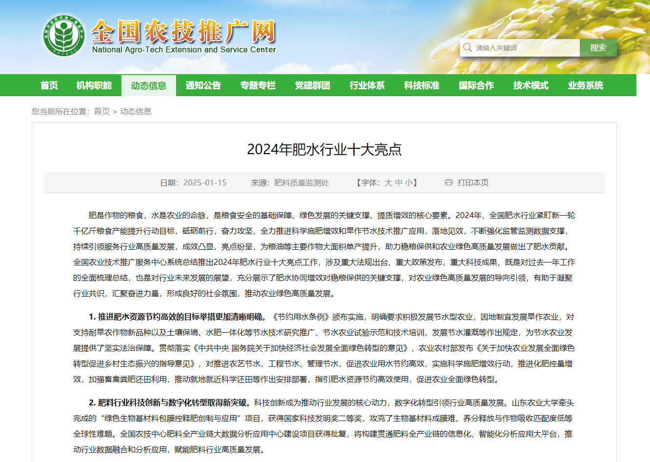 据了解,全国农业技术推广服务中心是农业农村部直属单位,负责多项全国农业重大技术、新型品质、优良品种试验、示范与推广;承担多项国家农业有害生物检测和相关标准制定;承担多个全国农业相关领域标准化技术委员会秘书处等职能工作等。全国农业技术推广服务中心系统总结推出2024年肥水行业十大亮点工作,既是对过去一年工作的全面梳理总结,也是对行业未来发展的展望,有助于凝聚行业共识,汇聚奋进力量,形成良好的社会氛围,推动农业绿色高质量发展。