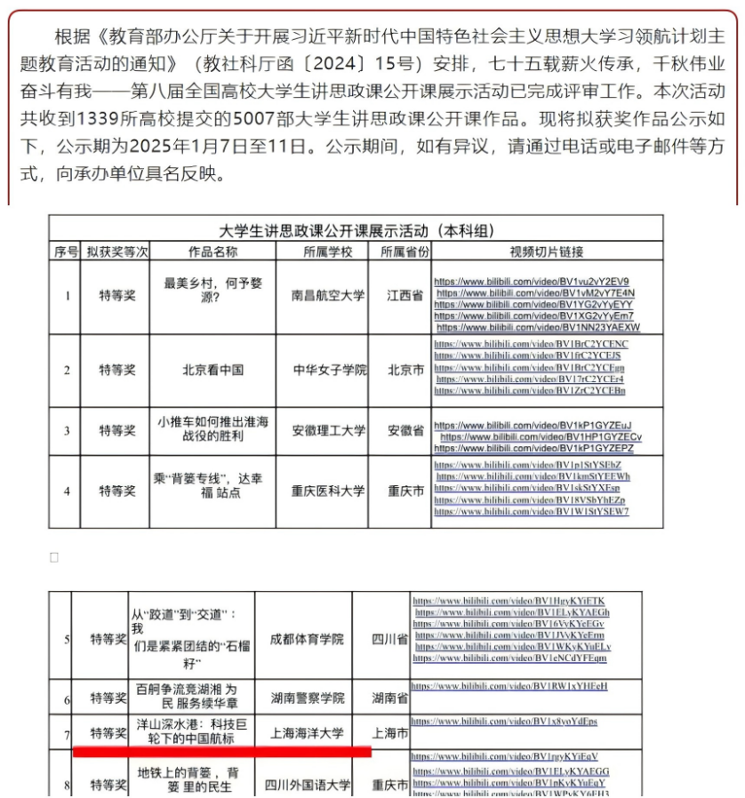 2025年1月7日,由教育部高校思想政治理论课教学指导委员会主办、南开大学马克思主义学院承办的“七十五载薪火传承,千秋伟业奋斗有我——第八届全国高校大学生讲思政课公开课展示活动”评审结果公示,由马克思主义学院李玉铭、董祥勇老师指导,陈俊文、张伊廷、程静、章诗涵、庞焱匀等同学共同创作的思政公开课《洋山深水港:科技巨轮下的中国航标》,在1339所高校提交的5007部参赛作品中获特等奖。