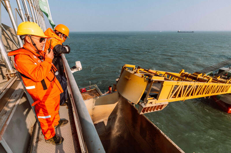 1月17日,夕阳下的厦门刘五店港区,北风劲吹。在距离中交一公局集团厦金大桥(厦门段)项目海上平台混凝土操作员梁芝敬站立位置不到30米的洋面上,一艘船身印有“帆顺168”字样的补料船,装载着4000多吨砂石缓缓抵近。船头前方延伸出一条25米长的传送皮带,将船上的砂料源源不断地送抵老梁眼前的钢制固料斗内。当天他们要趁着海水退潮带来的作业窗口,为站里补上700吨机制砂和900吨粒径10到20毫米的小石子,以确保混凝土站生产不停机。