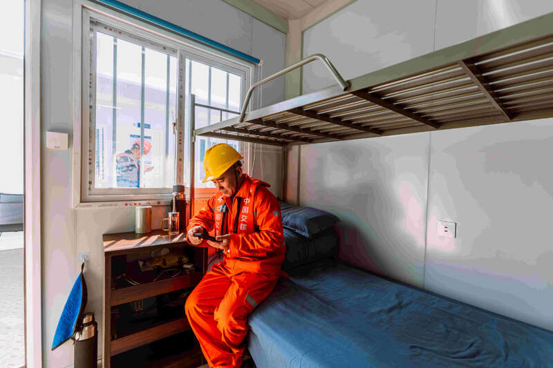 梁芝敬和工友们工作的位置在离岸2海里的海上。一座总面积5万多平方米的海上平台,构成了建设者们生活和工作的海上空间。工人们加班建设的刘五店航道桥,是厦金大桥(厦门段)关键控制性工程,全长1948米,是福建省内最大跨径桥梁,也是福建省首座全离岸式海中悬索桥。春节前,项目部要完成沉井系梁6000方以及主塔套箱6640方封底混凝土浇筑任务。为此,梁芝敬和工友们需要不间断倒班作业,以保障工程任务能够如期完成。而记者采访时,距离梁芝敬上一次离开海上平台,已经过去57天。