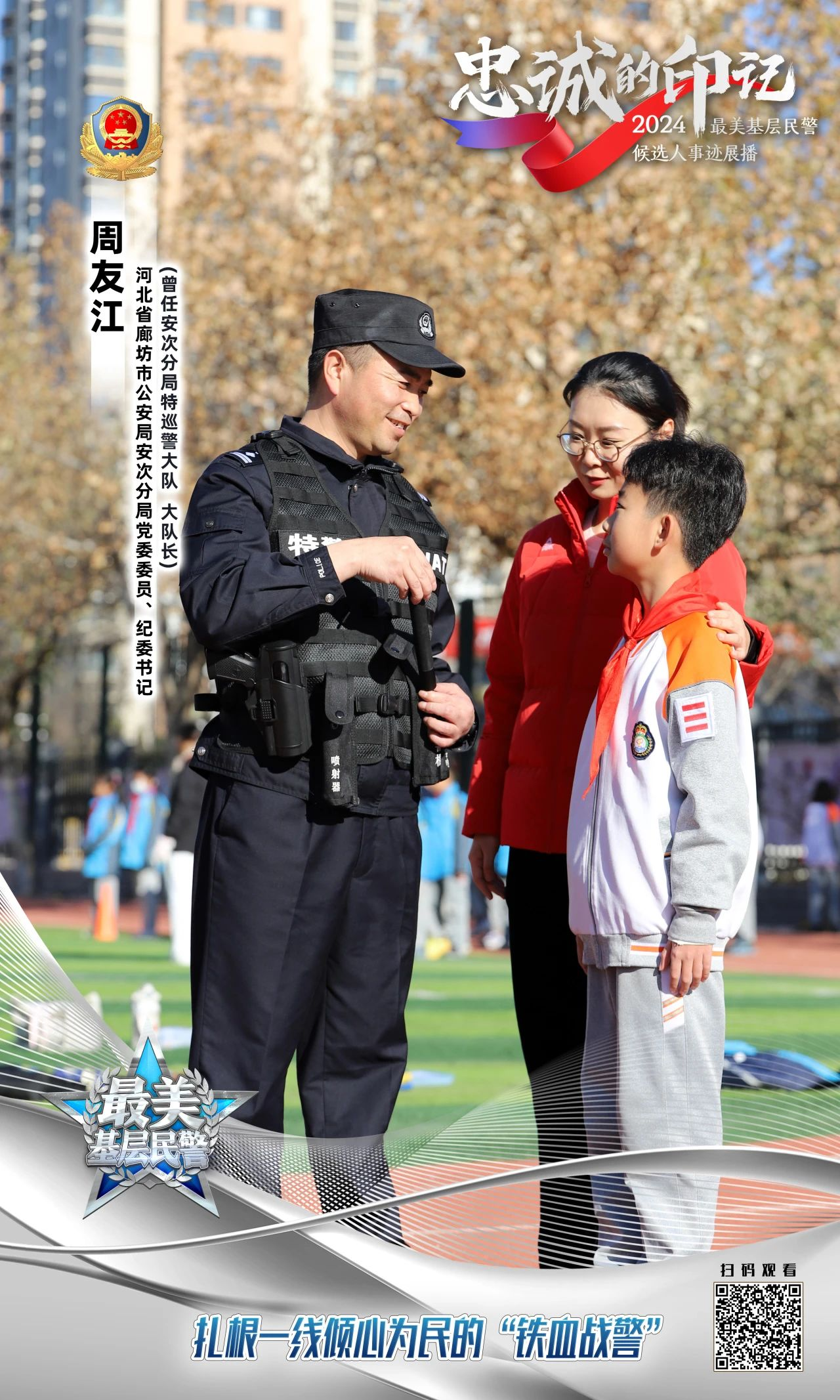 日前,廊坊市公安局警察荣誉仪式在警察大学举行,现任河北省廊坊市公安局安次分局党委委员、纪委书记周友江也在此次 评选中被评为2024“最美基层民警”。 “有第一必争,有红旗必扛”的精神贯穿着周友江工作的始终,他以实际行动诠释着基层民警的使命与担当,他的事迹激励着警大师生奋发向上、砥砺前行。