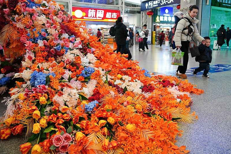 昆明火车站现繁花“孔雀” 扮靓春运旅途