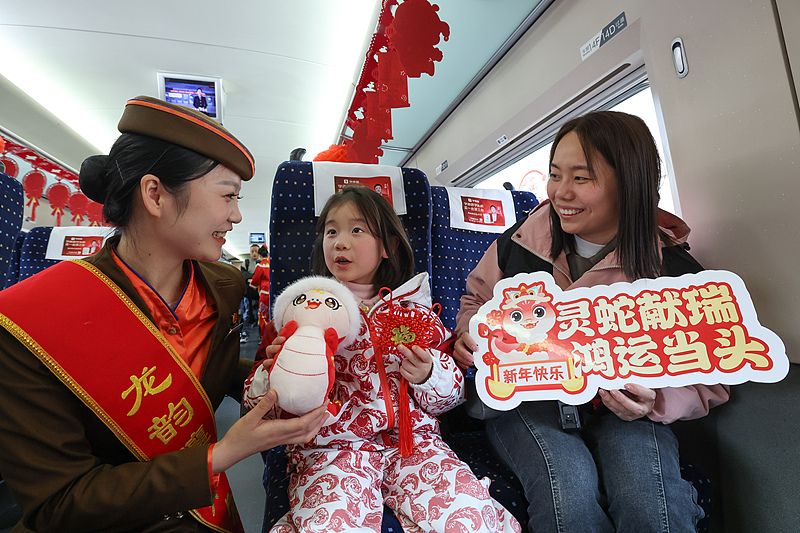 2025年1月21日,在湖北省十堰市开往襄阳市的G6818次列车上,襄阳客运段工作人员为小旅客送上祝福。