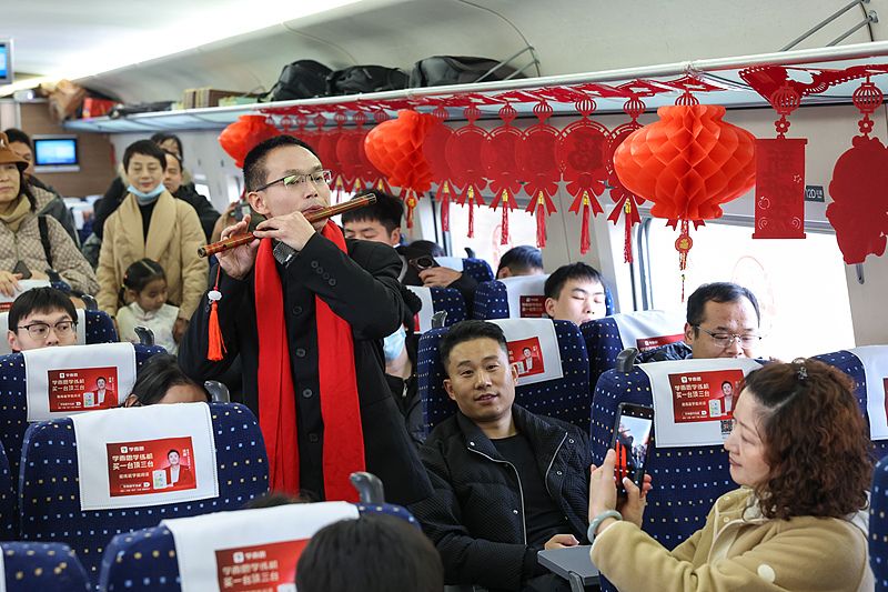 2025年1月21日,在湖北省十堰市开往襄阳市的G6818次列车上,襄阳市文联文艺志愿者表演竹笛。