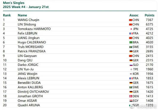 男子单打,中国队球员王楚钦以7367分排在榜首,林诗栋位列第二,梁靖崑第五,林高远第九。