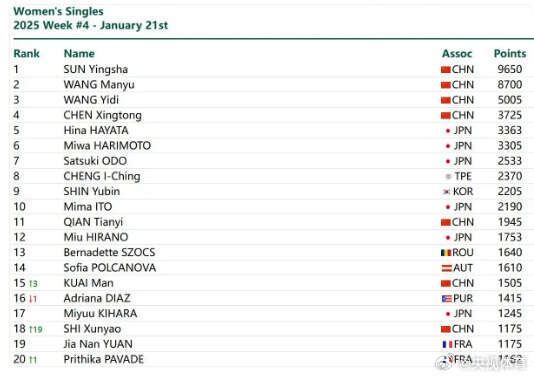 女子单打,中国队球员孙颖莎9650分排在榜首,王曼昱、王艺迪、陈幸同位居2—4位。