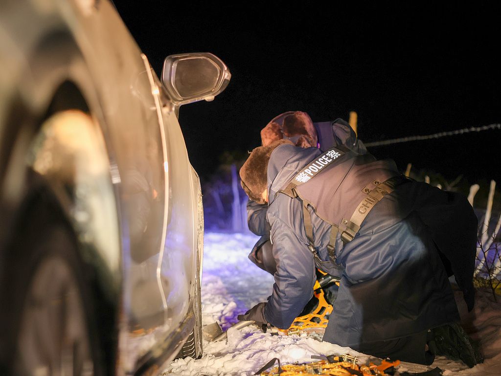 2025年1月20日晚间,新疆喀什边境管理支队塔什库尔干边境派出所民警救援被困车辆,清铲车轮下积雪。