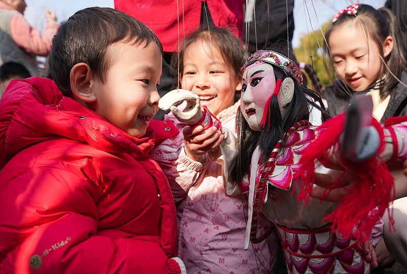 2025年1月21日,浙江省湖州市长兴县雉城街道高阳桥社区,孩子们和提线木偶互动。