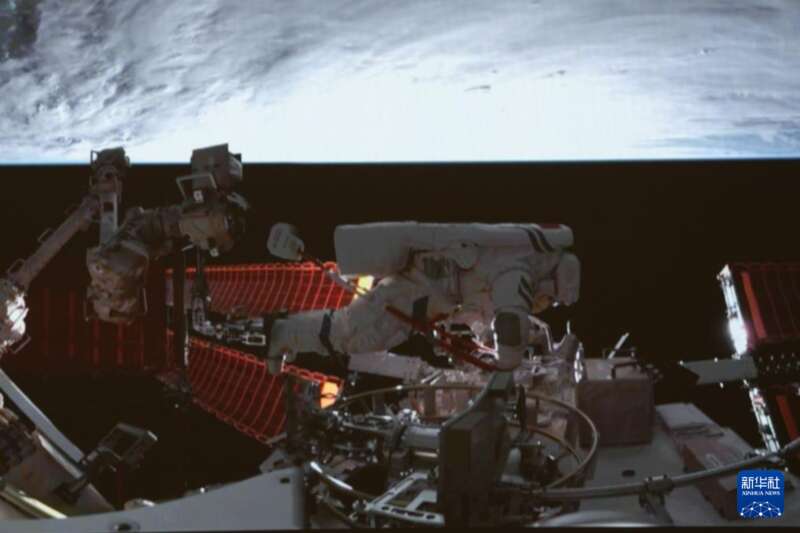1月20日在北京航天飞行控制中心拍摄的神舟十九号航天员宋令东在空间站组合体舱外工作的画面。新华社记者 刘芳 摄