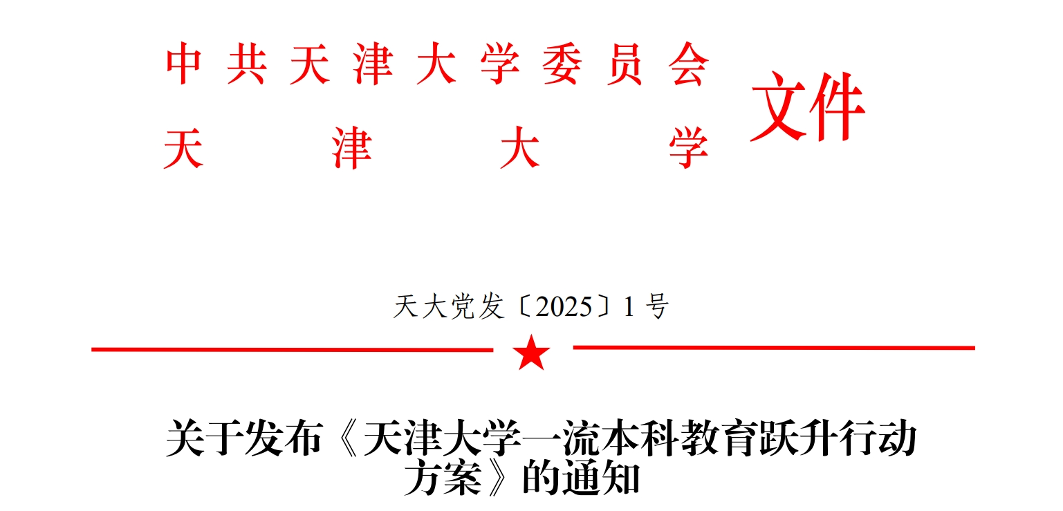 为贯彻党的二十大和二十届三中全会、全国教育大会精神,落实《 中共天津大学委员会关于进一步全面深化综合改革 服务教育强国建设的若干举措》部署,积极回应发展和培育新质生产力的重大需求,系统构建人才自主培养体系,着力造就拔尖创新人才,近日,天津大学以2025年1号文印发《天津大学一流本科教育跃升行动方案》,启动实施“一流本科教育跃升行动”(以下简称“跃升行动”)。