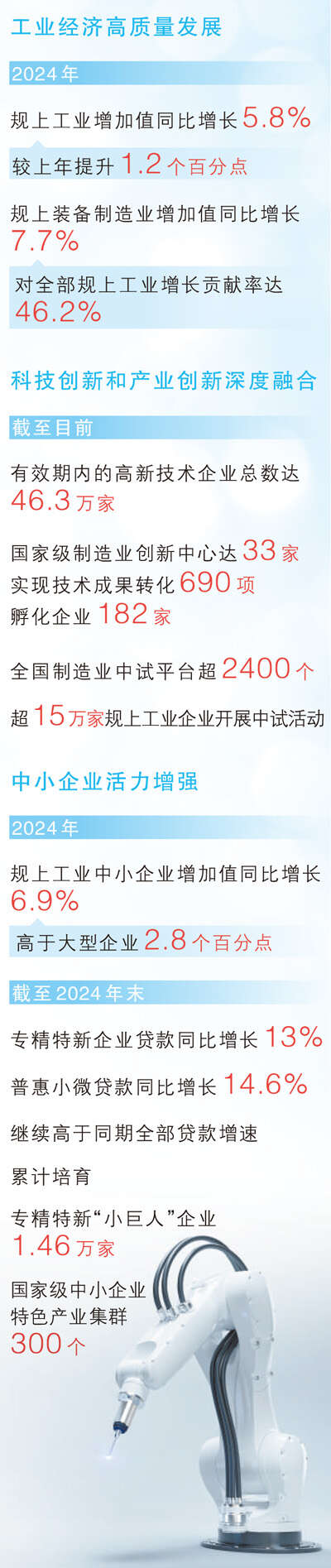 中小企业能办大事,是推动创新、促进就业、改善民生的重要力量。“2024年,中小企业经济运行稳中有进,规上工业中小企业增加值同比增长6.9%,高于大型企业2.8个百分点。”张云明介绍,工业和信息化部持续推动中小企业高质量发展。