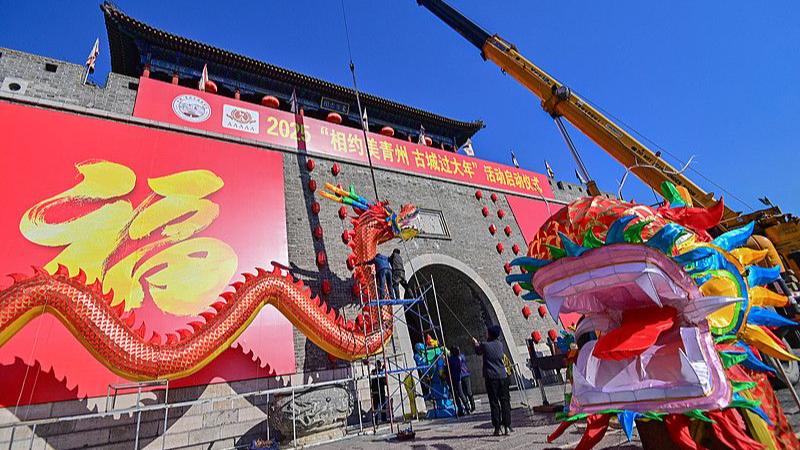 山东青州:数米高“福”字亮相城墙 巨型龙灯添喜庆