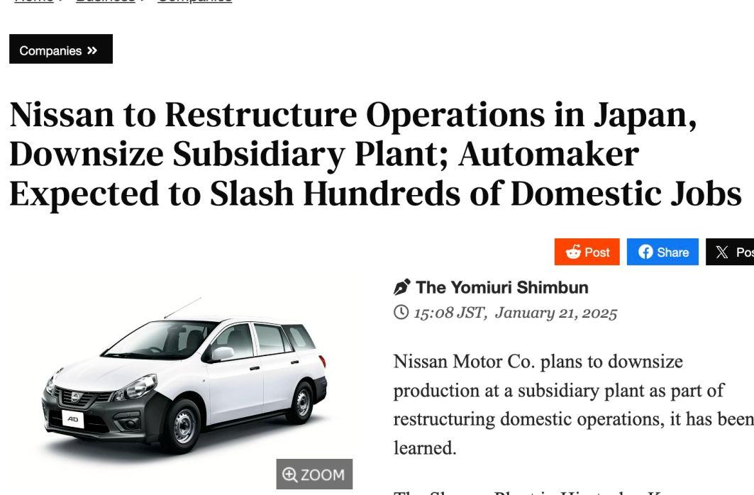 日媒:日产汽车重组日本业务 缩减子公司工厂规模