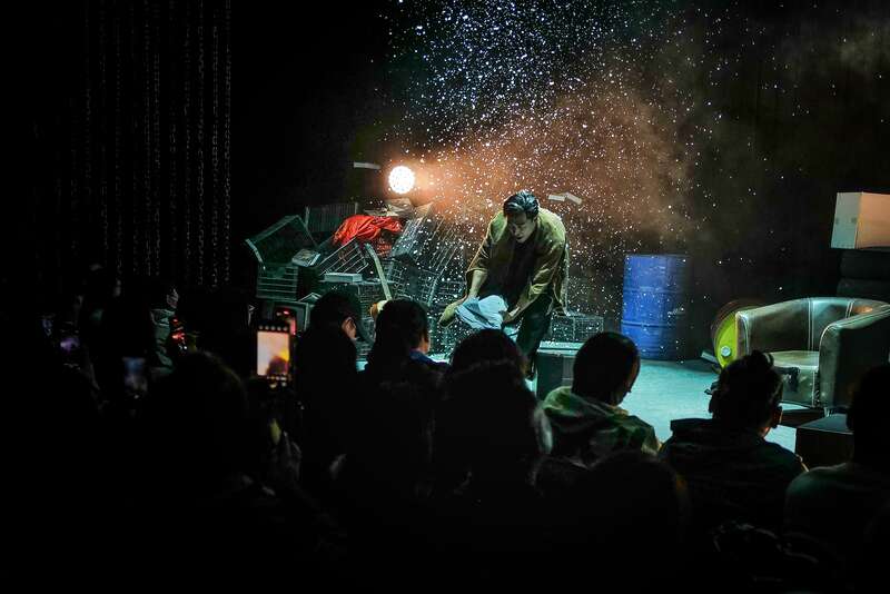 整场演出全程由一位演员完成,剧情环环相扣、层层推进,烧脑的同时富含幽默元素。脱口秀、吉他弹唱、河北梆子……演员18般武艺轮番上演。