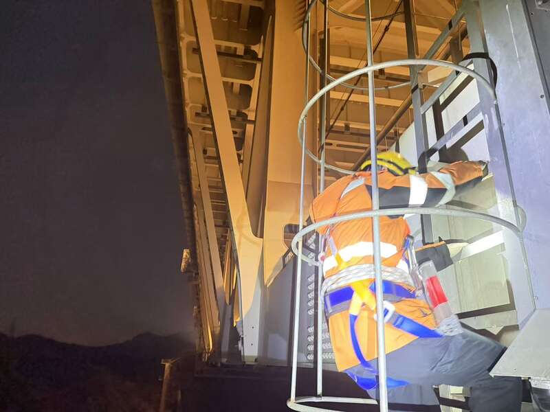走到作业地,顺着十几米的爬梯下到墩台上,今晚四个小时的“天窗”时间内吕文举他们需要将6个墩台上的30个支座状态全部保养一遍。