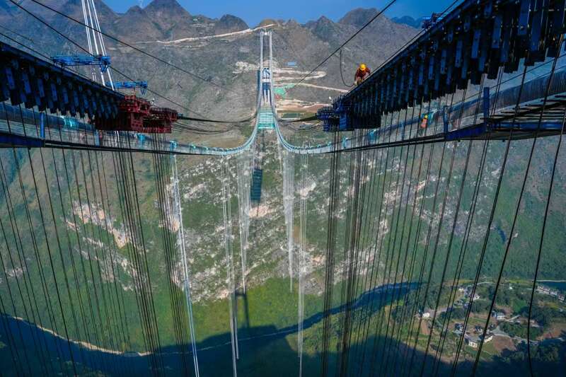 花江峡谷大桥则跨越这道“地球裂缝”,全长2890米、主跨1420米,桥面距水面垂直高度625米。它的桥高为世界第一、主跨为山区峡谷桥梁世界第一,被当地人称为“横竖都是世界第一”。