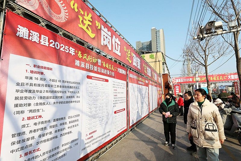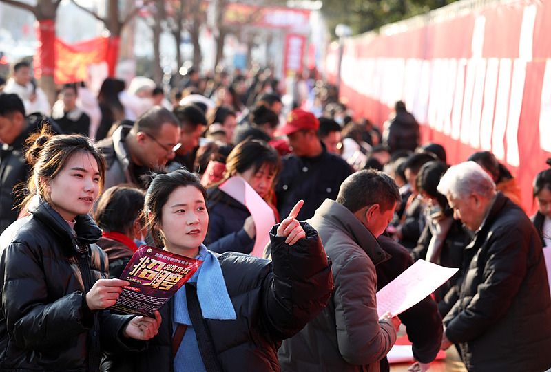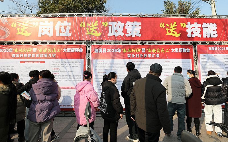 2025年1月22日,在安徽省淮北市濉溪县2025年“春风行动”大型招聘会现场,求职者在查看咨询了解招聘信息。