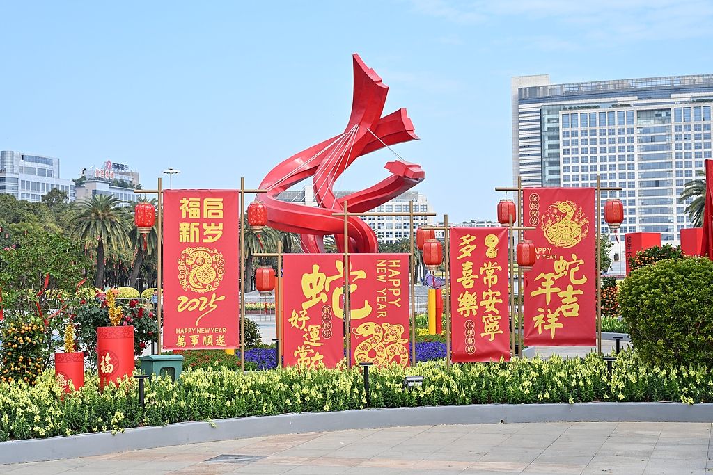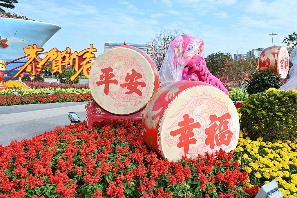 2025年1月24日,广东东莞,2025年中心广场春节花坛以“福归莞邑、金蛇贺春”为主题,总占地面积约1600平方米,由“华灯贺岁”“莞邑纳福”、“金蛇贺春”、“美满之路”4组大小各异的花坛组合而成。
