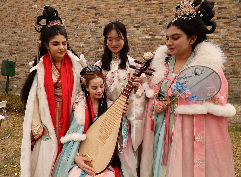 2025年1月23日,安徽省芜湖市镜湖区芜湖古城,身穿汉服的外国友人在体验中国传统乐器。