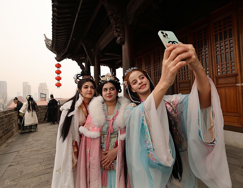 2025年1月23日,安徽省芜湖市镜湖区,身穿汉服的外国友人在芜湖古城长虹门前亲身体验中国的春节文化。