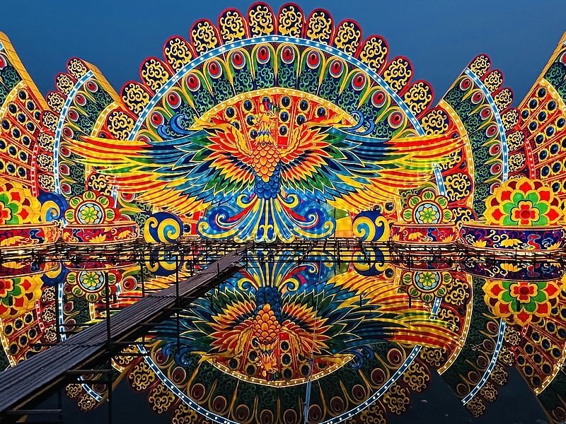 2025年1月22日傍晚,西安,水上的凤凰彩灯引得游客纷纷拍照。