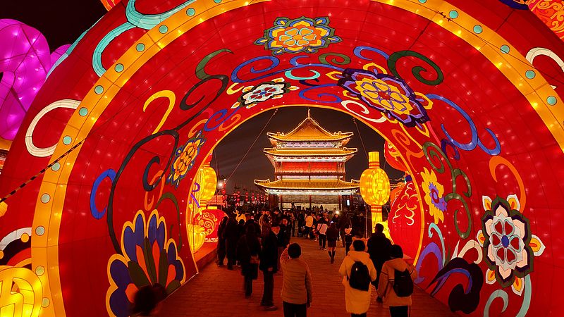2025年1月22日,陕西西安,2025年“长安灯会·西安城墙”新春系列文化活动现场,众多市民游客前来登城墙、赏花灯。