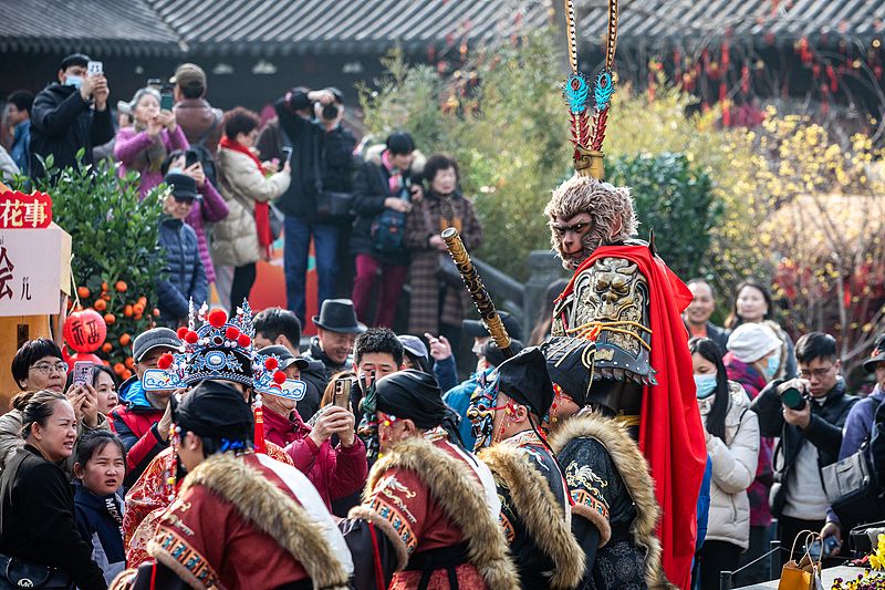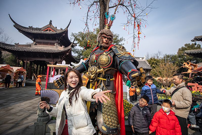 2025年1月23日,杭州,2025西湖迎春花展在西湖景区钱王祠开幕,“黑神话悟空机甲”巡游吸引了众多游客互动。