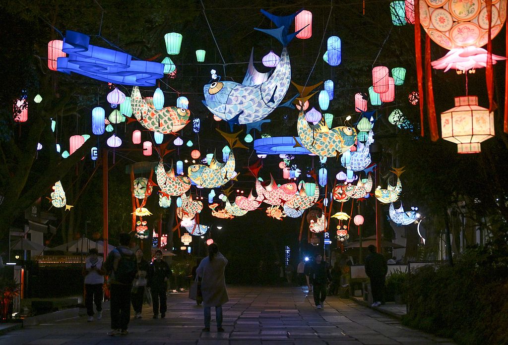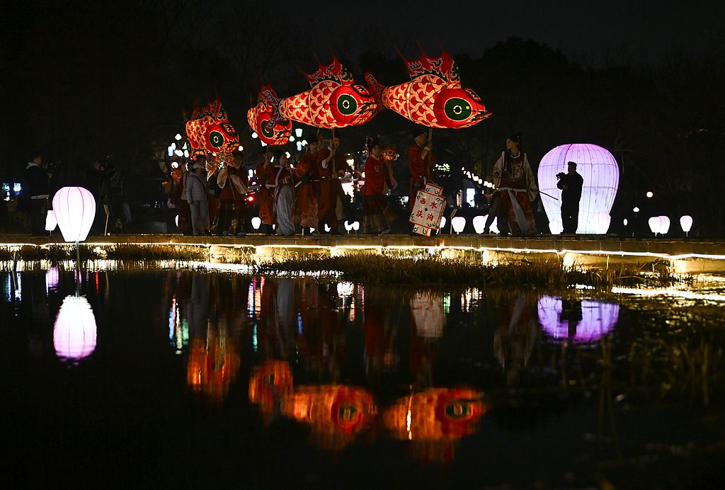 2025年1月23日,浙江杭州西溪国家湿地公园内,约千盏花灯入夜亮起,华丽的灯会年味十足,吸引游人欣赏。 中新社记者 王刚 摄