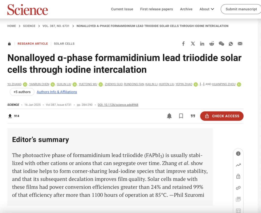 1月9日,北京大学周欢萍教授、张艳锋教授(共同通讯作者)在Science上发表了题为“Wafer-scale monolayer MoS2 film integration for stable, efficient perovskite solar cells”(晶圆级单层MoS2薄膜集成实现稳定、高效的钙钛矿太阳能电池)的研究论文。1月16日,周欢萍教授为独立通讯作者,再度在Science发表了题为“Nonalloyed α-phase formamidinium lead triiodide solar cells through iodine intercalation”(通过碘嵌入制备非合金α-FAPbI3太阳能电池)的研究论文。这是Science期刊在一周之内连续两次刊发周欢萍团队在钙钛矿太阳能电池领域的研究进展。