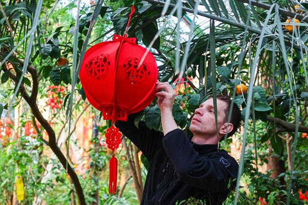 1月20日,俄罗斯莫斯科国立大学植物园(药草园)工作人员在亚热带温室内布置新春装饰,迎接即将到来的中国春节。视觉中国供图