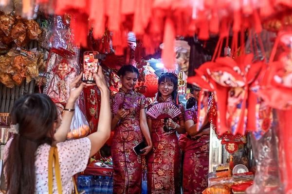1月22日,缅甸仰光的年轻人在当地年货市场试穿旗袍,置办春节新衣和装饰品。视觉中国供图