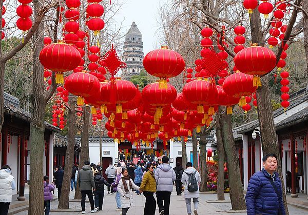 2025年1月25日,江苏苏州,各地游客在悬挂红灯笼、中国结喜庆氛围的虎丘景区游览。