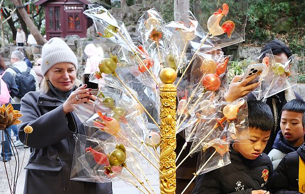 2025年1月25日,江苏苏州虎丘景区,一名外国游客被琳琅满目的吹糖人作品吸引。